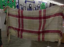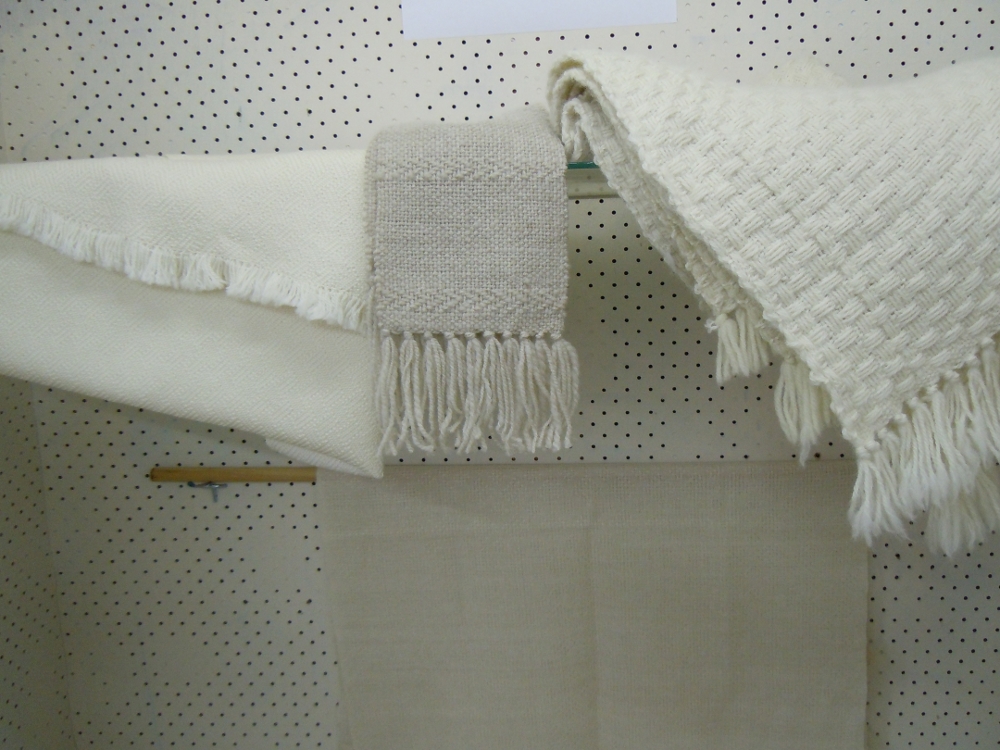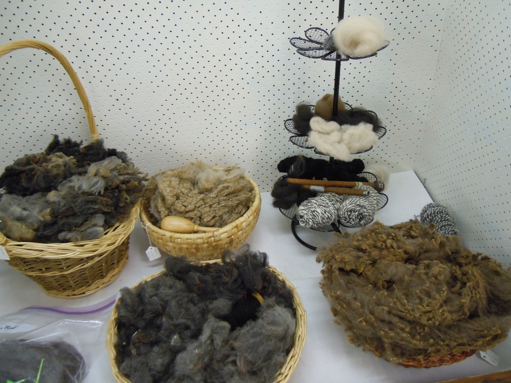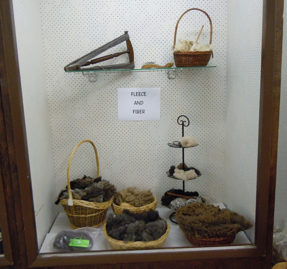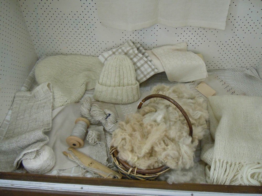 handspun items. Included in the cabinet are items made from the Cormo sheep wool that we used for demonstrating the stages of wool processing.