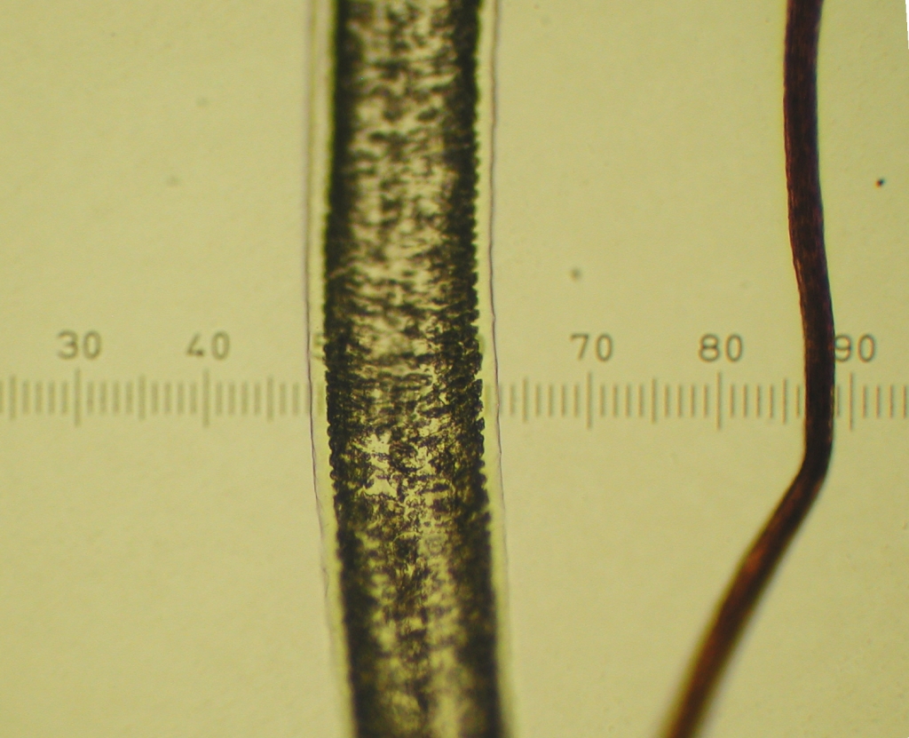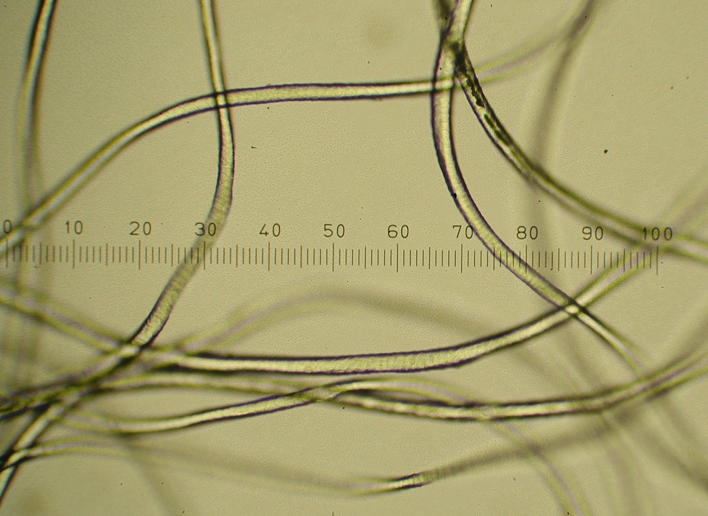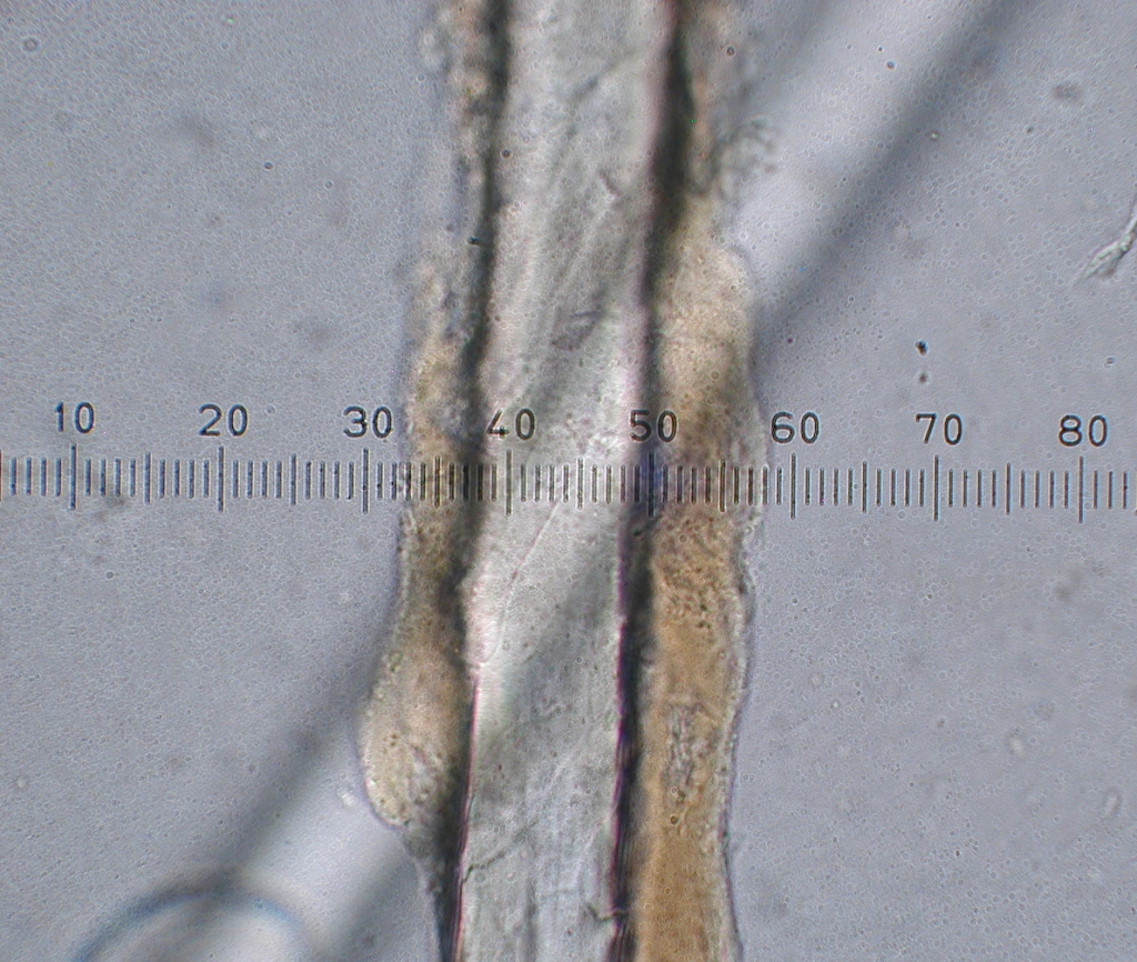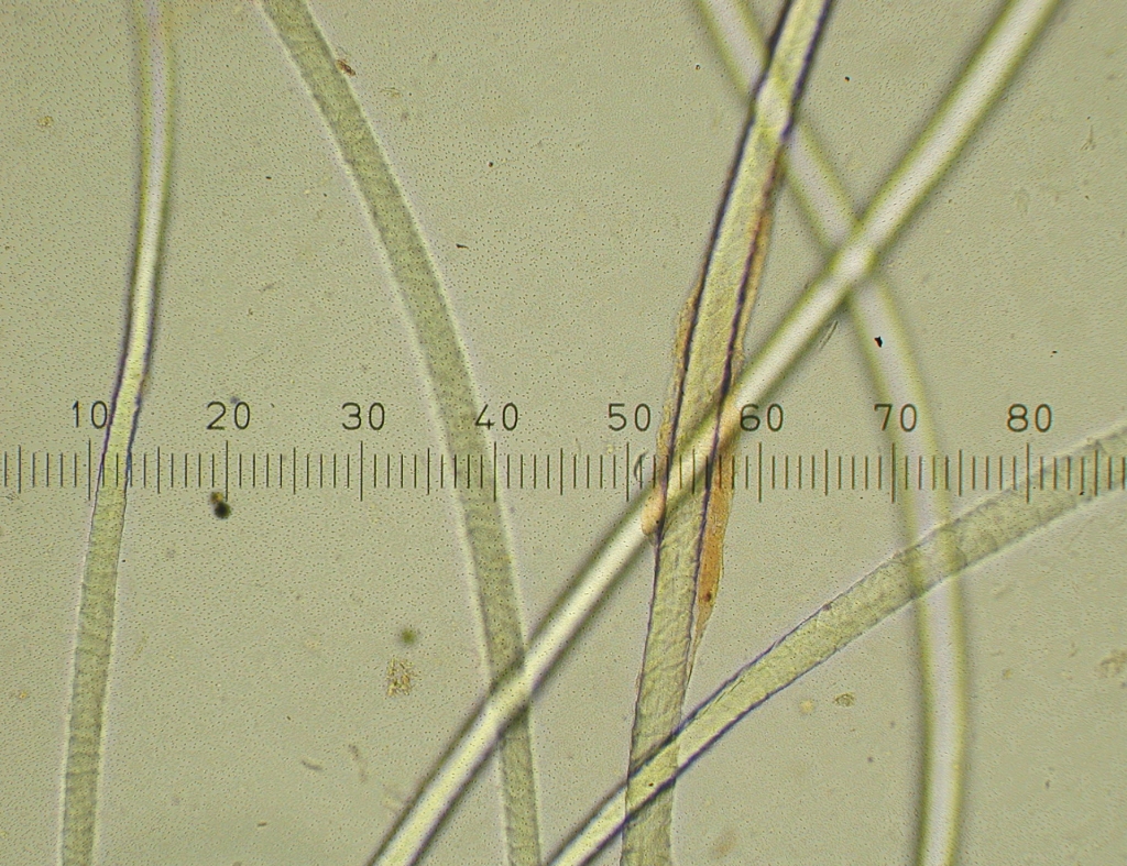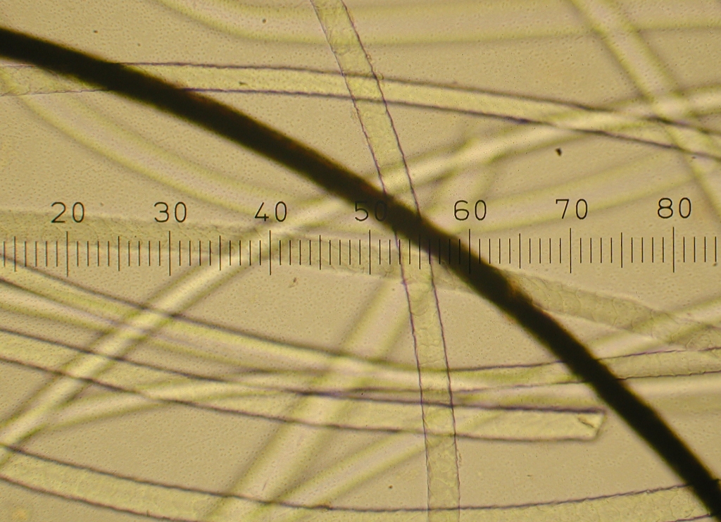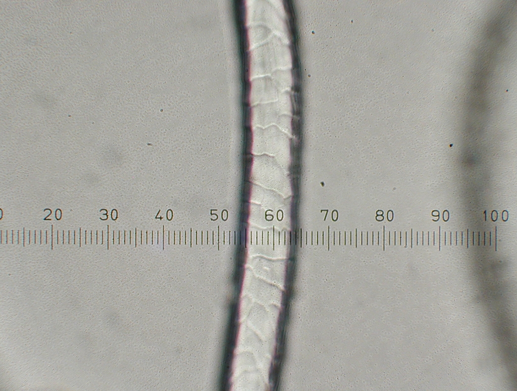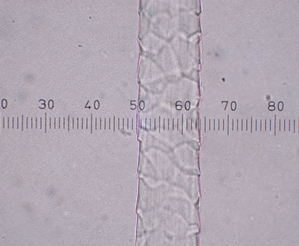 Gotland, 400x. The size of the fiber (13 x 2.5=32.5 microns approximately) and the scales can be seen. |