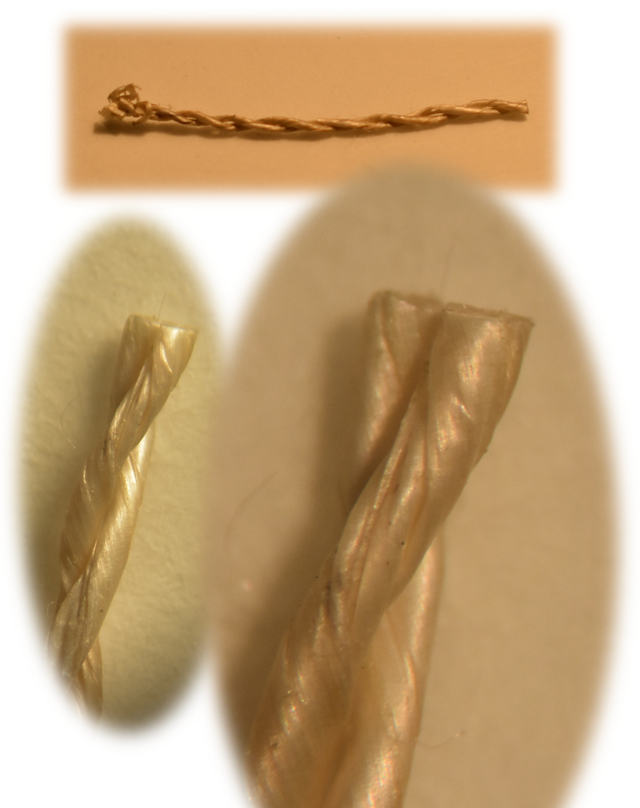 This composite image shows a single twisted or spun segment of yarn. You can see the two small single strands of yarn have been twisted around each other (i.e. two-ply) to make a relatively uniform and strong material. Original magnifications 1x, 10x, and 20x with incident incandescent light. |