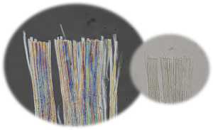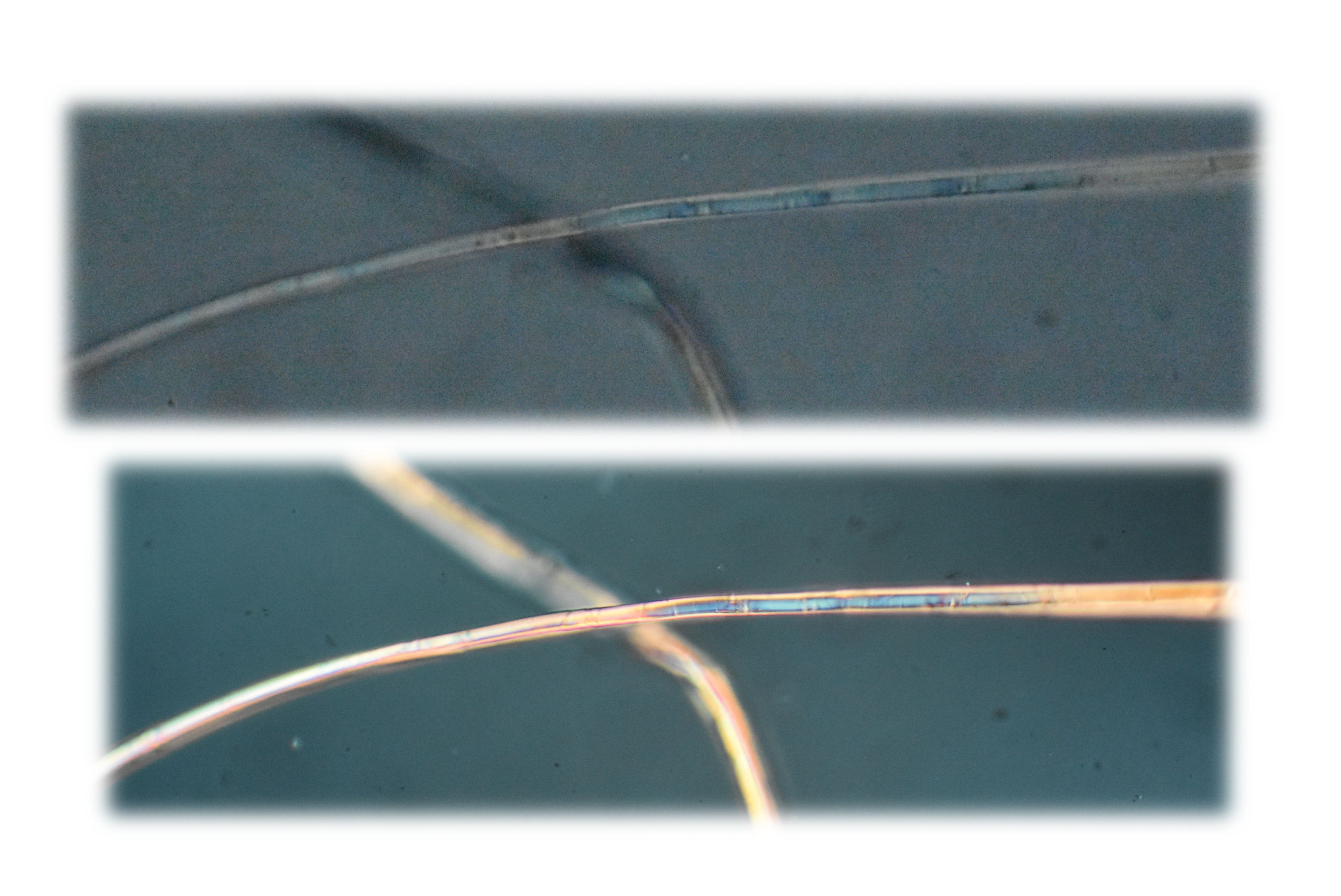 This composite image shows fibers using both conventional light microscopy (upper panel) and cross polarizing lenses (lower panel). |