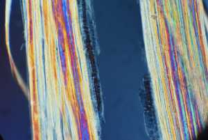 This is another polarization microscopic view showing several individual fibers exhibiting cross hatches. The outside of the fibers appears smooth. |