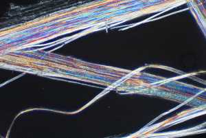Another high power magnification view showing bundle of fibers with some separating from the main bundle on the right side. Polarization microscopy view. |