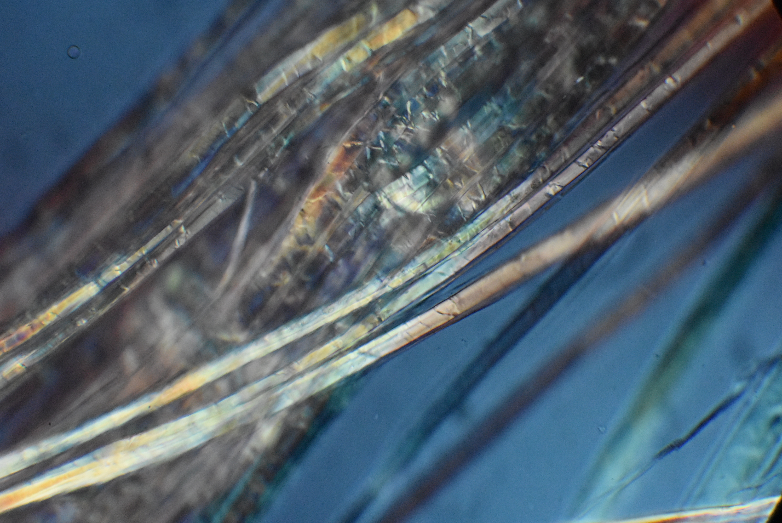 Another polarization microscopic view showing a single fiber in the foreground twisting slightly as it courses up and to the right. Again, the fiber appears somewhat flat. There is small air bubble at the upper left. |