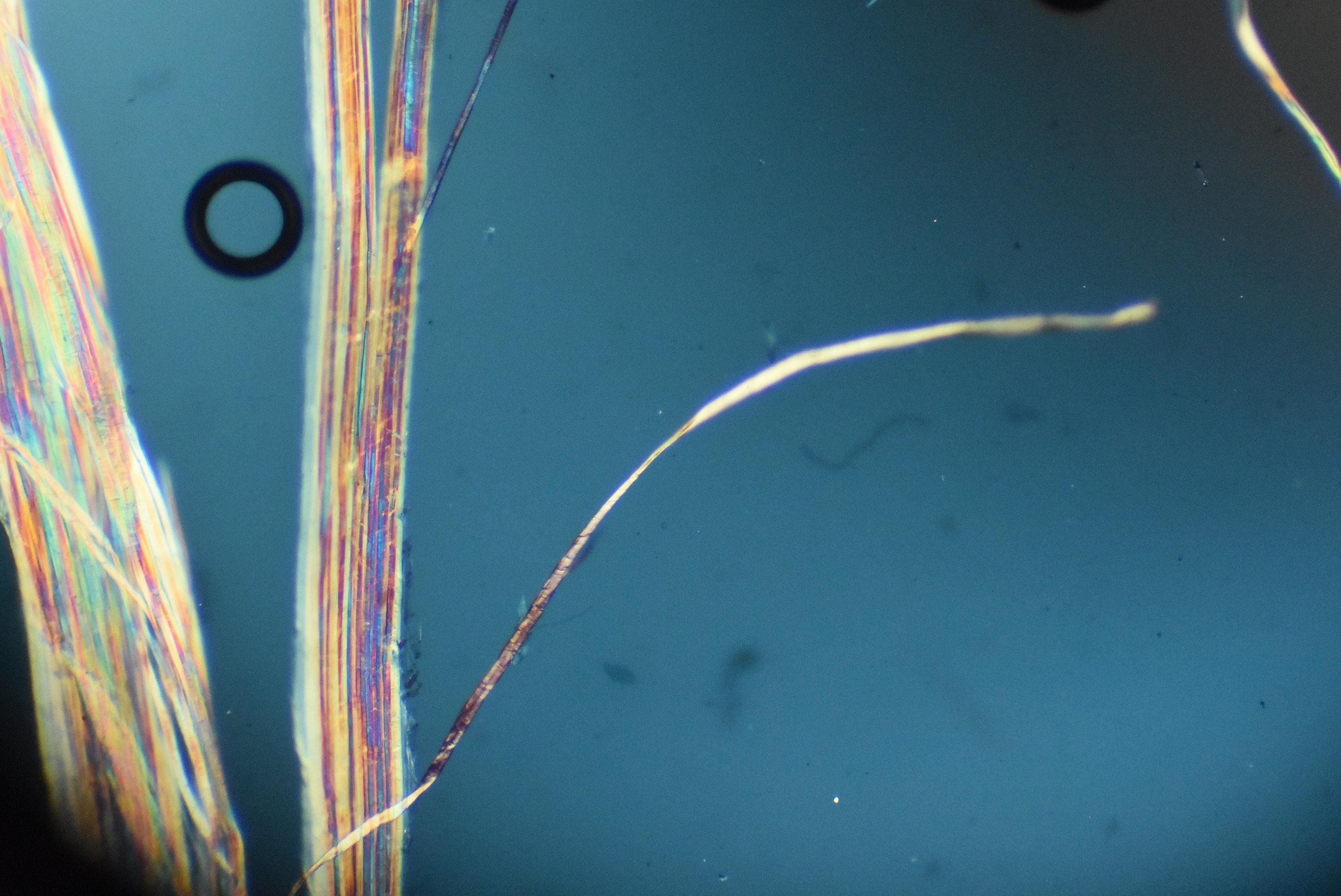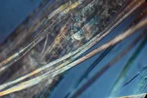 Notice the individual fiber on the right...it has a flattened appearance as it courses up and to the right; again suggesting a relatively flat fiber. Also notice the short cross hatches in the blue colored fibers on the left. Those may represent some surface kinking or other irregularities. The sharply circumscribed black object on the left is an air bubble. |